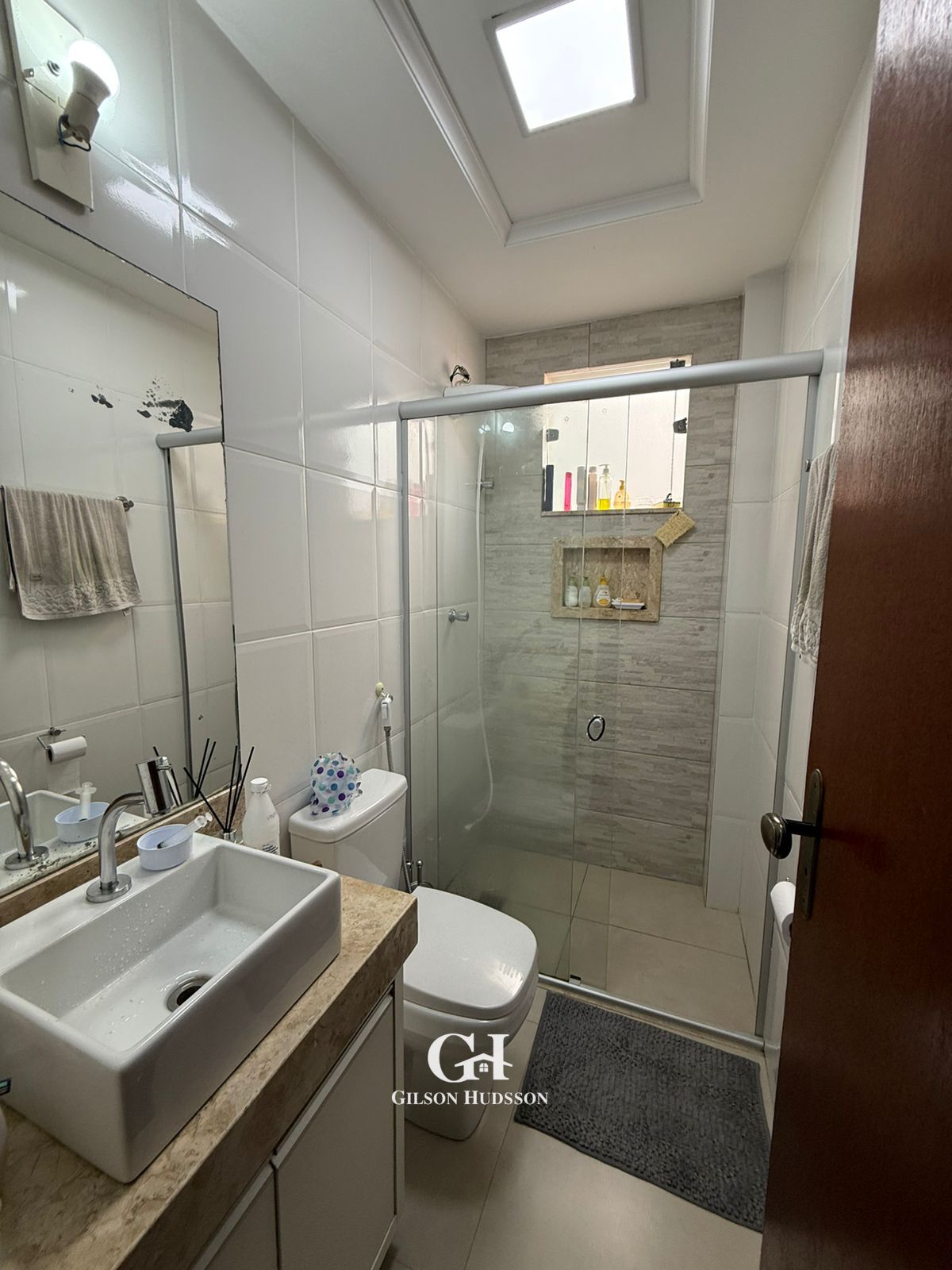 ➡️ Banheiro social com armário e box em blindex.