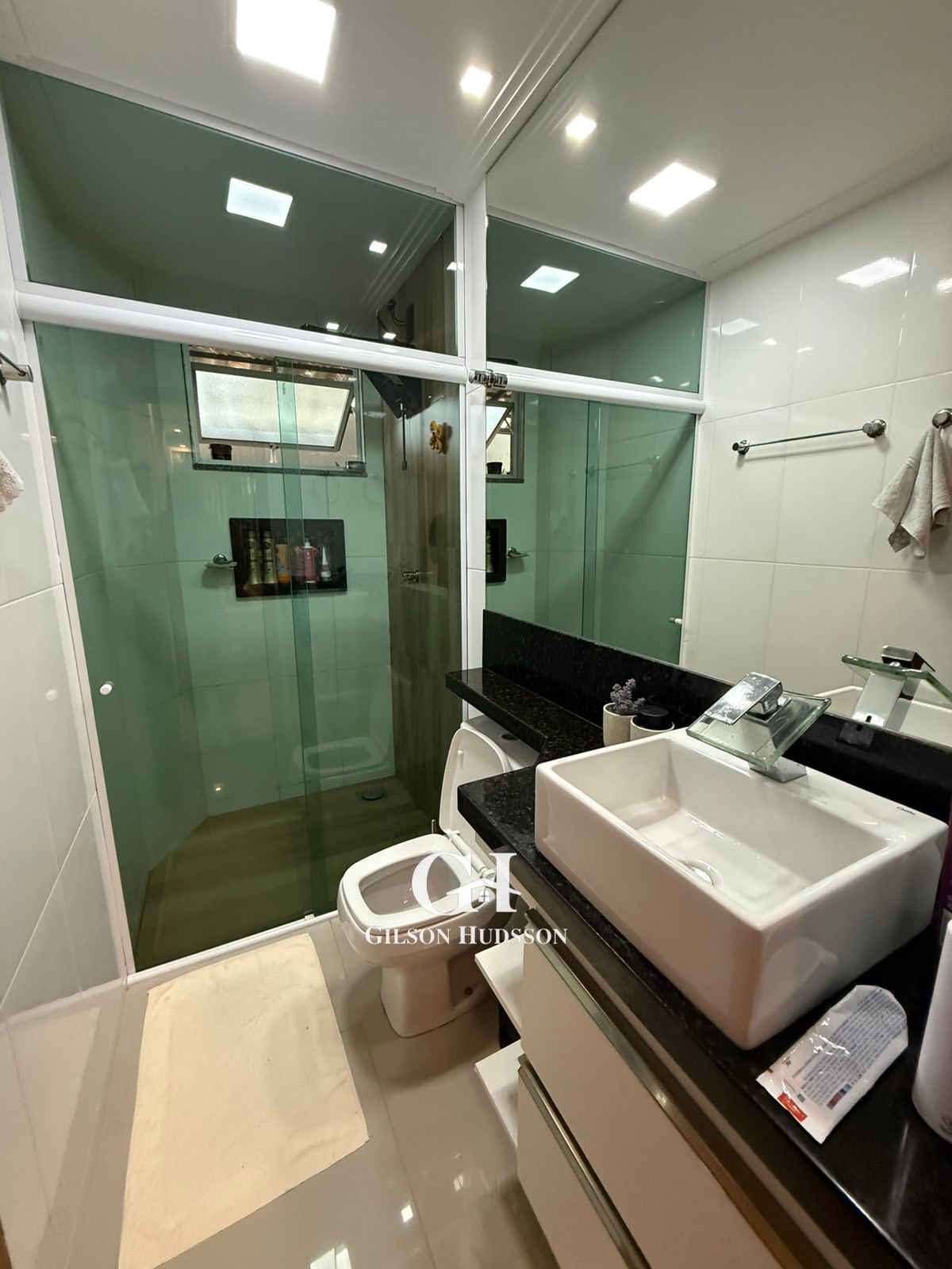➡️ Banheiro social com armário e box em blindex.